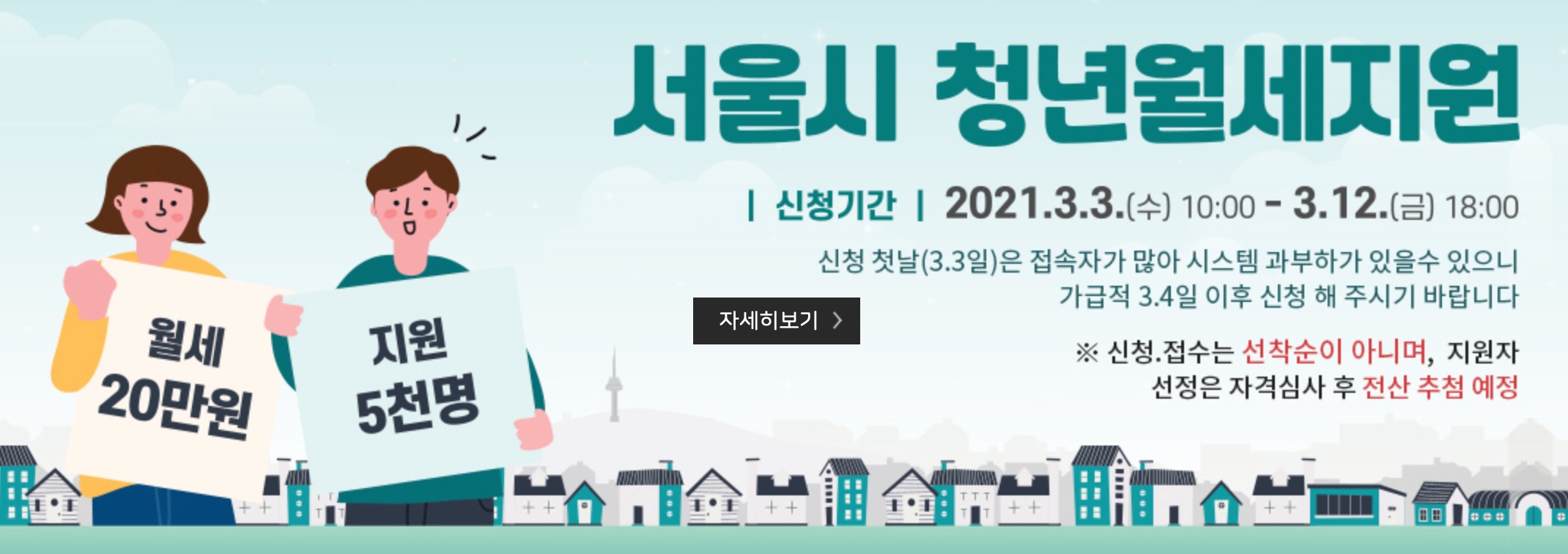 자취하시는 분들께 좋은 정보를 가지고 왔습니다! 최근에는 전세 매물이 많이 사라지고 월세로 방을 구하셔야 하는 분들이 많을텐데, 서울에서 월세로 사시는 청년분들은 한달에 최대 20만원의 월세 지원을 받을 수 있는 기회입니다!!