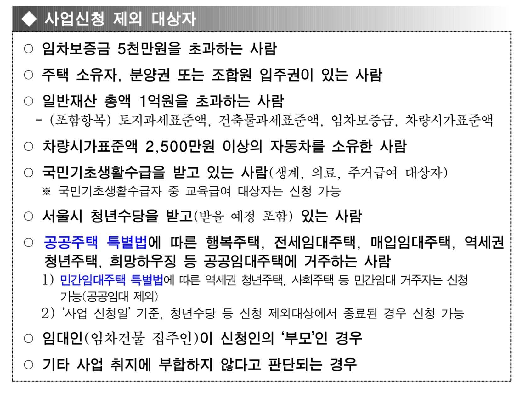 위에 해당하시는 분들은 서울시 청년월세지원 사업에 지원하실 수 없으니 참고하시기 바랍니다!