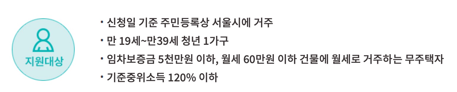 서울시에 거주하는 만 19~39세 사이의 청년 1가구로 보증금 5천만원 이하, 월세 60만원 이하의 계약에 월세로 거주하는 무주택자여야 하며, 기준중위소득 120% 이하를 만족해야 합니다.